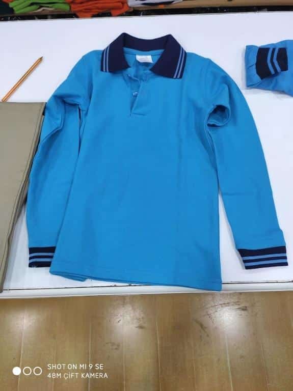 ****ANA RENK TURKUAZ) – UZUN KOL (KIŞLIK) KISA KOL (YAZLIK) PENYE KUMAŞ – YAKALI – YAKA VE KOL RİBANASI LACİVERT – ÇİFT AYRIK TURKUAZ) ÇİZGİLİ –